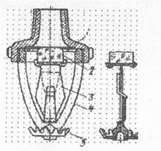 Рис. Устройство спринклерной головки: 1- металлическая диафрагма; 2 - стеклянный клапан; 3 - замок; 4 - рама; 5 – розетка.