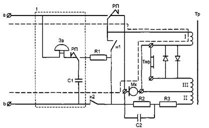 На рис. 1 показан контакт номеронабирателя н1, который шунтирует телефон на время набора номера и тем самым предупреждает треск в телефоне.