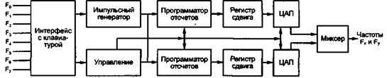 Генераторы и связь с клавиатурой. Многочастотный генератор (рис. 11) синтезирует частоты с помощью цифровых отсчетов. Программатор отсчетов по командам управления вырабатывает цифровые значения, соответствующие амплитуде сигнала в данной временной точке, и они последовательно через регистр сдвига поступают на цифро-аналоговый преобразователь ЦАП. На его выходе получается аналоговый сигнал, который передается в линию.