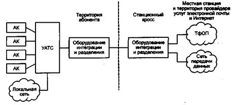 На заре появления услуг электронной почты и Интернет потребитель приобретал модем и через телефонную сеть общего пользования получал доступ к соответствующей сети. Наиболее подробно сети абонентского доступа рассмотрена в. С развитием потребностей в услугах передачи данных корпоративные пользователи организовывали телефонную связь через учрежденческую АТС (УАТС). Услуги передачи данных обслуживались локальной сетью LAN (Local Area Network), потоки информации объединялись в системе передачи к станции, где снова разделялись на два потока. Система объединения и разделения потоков (рис. 19) получила название «интегральное оборудование разделения доступа» (IAD, Integrated Access Device).