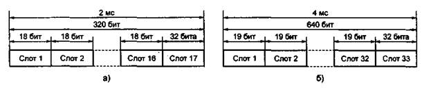 Имеется и другой вариант построения цикла передачи (рис. 1.42, 6): из 32-х битов последнего слота 19 используется для синхронизации, а 12 — для передачи служебных сигналов. В состав этих сигналов входит, например, сигнал активизации оборудования, переводящий оконечное оборудование из дежурного в активный режим, что значительно экономит энергию и делает эксплуатацию системы более безопасной и надежной.