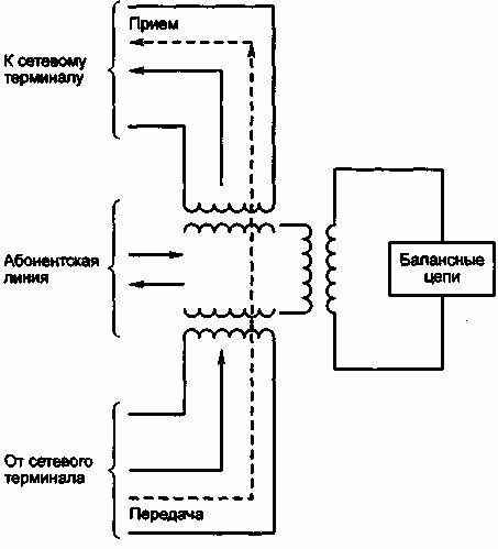 Поэтому имеется третий трансформатор, задача которого — порождать в трансформаторе цепи передачи компенсационный ток, текущий в обратном направлении и равный по величине току, поступившему от приемника. Для регулировки этого тока применяется балансный контур, комплексное сопротивление которого регулируется в зависимости от параметров абонентской линии.