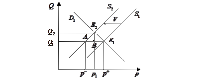 руб. на каждую единицу происходит сдвиг кривой предложения влево, объём продаж возрастает, цена для покупателей понижается, а цена, получаемая производителями, повышается (рисунок 1.2.7). Таким образом, производителям поступает в распоряжение только часть дотации, другая часть поступает в бюджет покупателей. Аналогичным будет результат при получении дотации покупателями: линия проса сдвинется на туже величину
