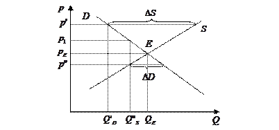 Нижний предел цен («пол») – цена выше равновесного уровня, устанавливаемая с целью государственной поддержки некоторых отраслей экономики; приводит к избытку продукции.