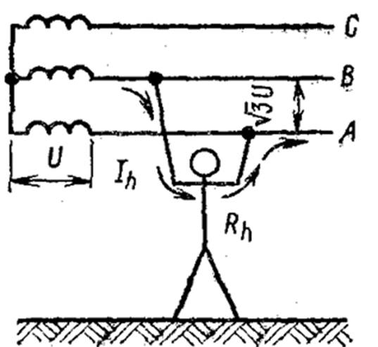Ток через тело человека превышает значения порогового неотпускающего (6... 10 мА) и фибриляционного (50...100 мА). Поэтому обычно такой контакт с токоведущими частями завершается летальным исходом (если пострадавшему своевременно не оказана помощь).