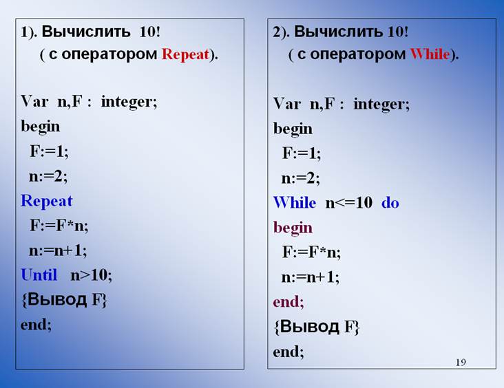 · Итерационные циклы (циклы, завершающиеся по выполнению или нарушению условий)- циклы While, Repeat.