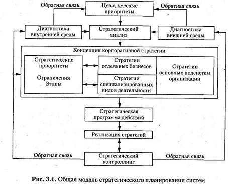 Процесс разработки любых стратегий называется стратегическим планированием. В более широком смысле стратегическое планирование — это требующая определенных ресурсов совокупность мероприятий, осуществляемых организацией для выполнения задач на основе принятых стратегий. Встречается в литературе и такая трактовка — процесс определения главных целей и стратегических линий исследуемого объекта, которым подчинено развитие, использование и распределение имеющихся ресурсов для достижения этих целей.