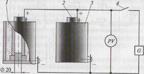 Определение коррозионной активности грунта по отношению к стали по поляризационным кривым производится по схеме, показанной на рис. 5.6, которая включает в себя источник регулируемого напряжения постоянного тока G; прерыватель тока ПТ; стакан вместимостью не менее 1 л из материала, обладающего диэлектрическими свойствами; вольтметр PV с внутренним сопротивлением не менее 20 кОм и миллиамперметр РА; электроды El и Е2. К каждому электроду припаивают изолированный проводник. Пробу грунта отбирают, сохраняя ее влажность, и помещают в стакан. Один электрод присоединяют к положительному полюсу источника тока, другой — к отрицательному. Для снятия поляризационной кривой электроды поляризуют при увеличении плотности тока. При этом достаточно задания трех-четырех значений тока. На основании полученных данных строят диаграмму.