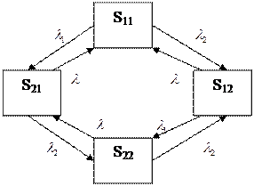 Пример. Техническая система S состоит из двух узлов I и II, каждый из которых независимо от другого может отказывать. Поток отказов первого узла пуассоновский с интенсивностью lI, второго также пуассоновский с интенсивностью lII. Каждый узел сразу после отказа начинает ремонтироваться (восстанавливаться). Поток восстановлений (окончаний ремонта узла) для обоих узлов – пуассоновский с интенсивностью l. Составить граф состояний системы и написать уравнение Колмогорова. Состояния системы: S11 - оба узла исправны; S21 – первый узел ремонтируется, второй исправен; S12, S22.