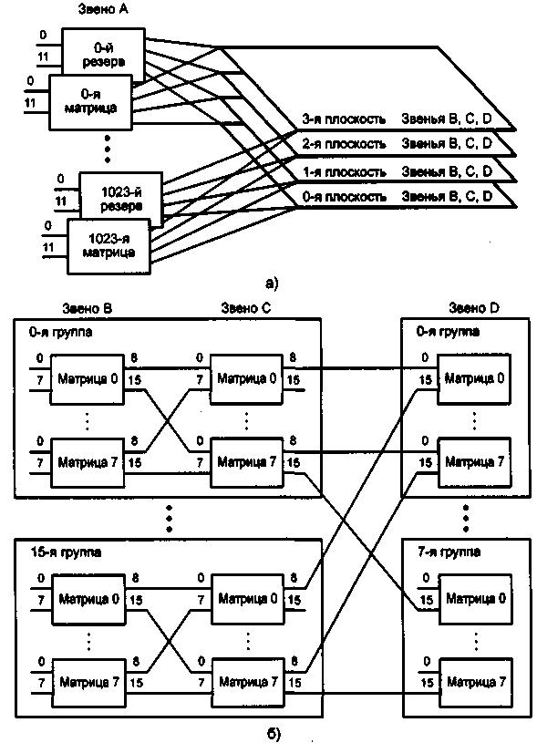 Этот тип группообразования характерен тем, что все источники нагрузки сосредоточены в одних и тех же матрицах. По сравнению с уже изучавшимися типами группообразования отсутствует сторона, в которую включаются только источники одного типа (например, абонентские комплекты, таксофоны и другие терминалы), а с другой стороны — только объекты канального типа (входящие и исходящие комплекты). В предыдущих системах это вызывало необходимость создания ступеней концентрации. В данном случае подключение источников с резко различающейся нагрузкой требует их первоначального распределения по различным матрицам первой ступени таким образом, чтобы средняя нагрузка на вход соответствовала заданному качеству обслуживания и определялась теоретическими расчетами телетрафика. Однако, как показано на рис. 12, а, в случае необходимости можно поставить ступень сжатия в виде матрицы 12x4 (звено А). Ступень сжатия также выполняет функции обеспечения надежности во многих конфигурациях станции. В данном случае она обеспечивает доступ от входных трактов к четырем плоскостям коммутационного поля. Этим обеспечивается четырехкратный резерв коммутационного поля (коммутационное поле — это один из блоков, существенно влияющих на надежность станции). Однако в большинстве случаев используется двукратный резерв (дублирование). В этом случае либо некоторые из выходов звена А остаются незадействованными, либо в каждую плоскость от ступени концентрации ведут две линии, что снижает максимальное количество входов. Но, как можно видеть из рисунка, число входов и так достигает большого значения.