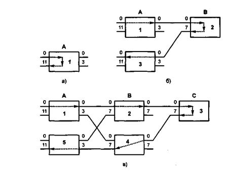 , то соединение устанавливается в пределах звеньев А, В и С и необходимо передать 5 команд (рис. 13, в).