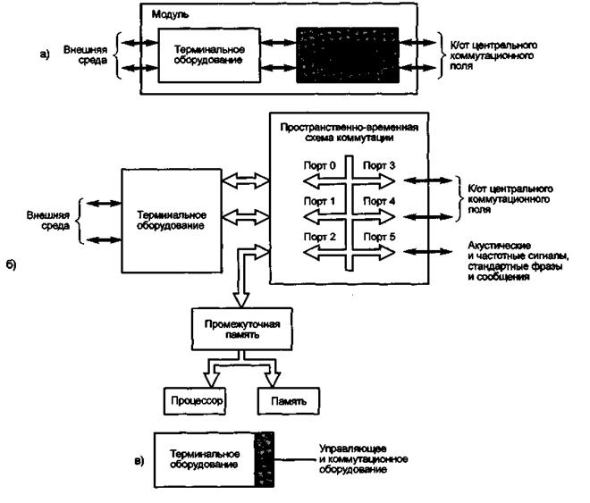 На рис. 14, 6 показаны основные составляющие модуля. На рис. 14, в показано условное обозначение этого модуля. Часть, закрашенная серым цветом, соответствует управляющему и коммутационному оборудованию. Коммутационное поле модуля коммутирует информационные потоки к центральному коммутационному полю, а управляющую информацию — к процессору. Для обеспечения синхронизации процессор подключен через промежуточную память к одному из портов коммутационного поля. Это позволяет ему непосредственно подключаться к центральному полю и передавать необходимые сигналы управления в сторону внешних источников. Кроме того, при наличии специальной операционной системы он может иметь доступ к памяти другого модуля, что создает большие программные возможности и увеличивает возможность наращивания ресурсов.