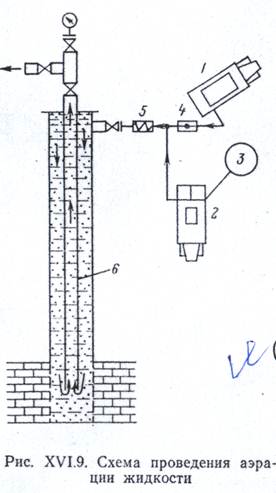 Насосны агрегат из ёмкости 3 подает воду в аэратор 5. Компрессор нагнетает сжатый воздух ваэратор через обратный клапан 4. В аэраторе происходит смешивание воды и воздуха, который частично растворяется в воде Смесь воды и воздуха поступает и затрубное пространство и далее к башмаку НКТ 6.