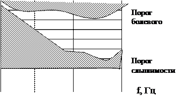 Верхняя кривая рис. 5 соответствует порогу болевого ощущения (L = 120 – 130 дБ). Звуки, превышающие по своему уровню этот порог, могут вызвать боли и повреждения в слуховом аппарате. Область на частотной шкале, лежащая между этими кривыми, называется областью слухового восприятия.