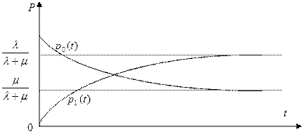 Это уравнение естественно решать при начальных условиях p0(0)=1; p1(0)=0. Уравнение (9.5) легко может быть решено не только для простейшего потока заявок (l=const), но и для случая l=l(t). Приведем решение (9.5) только для случая l=const: