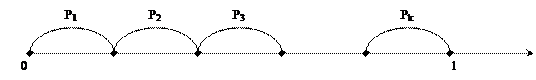 Пусть имеется полная группа несовместных событий: А1,А2,…Аk с вероятностями р1,р2,…рk. Т.к. события несовместны и образуют полную группу, то р1+р2+…+рk=1. Разделим весь интервал от 0 до 1 на k участков длиной р1,р2,…рk.
