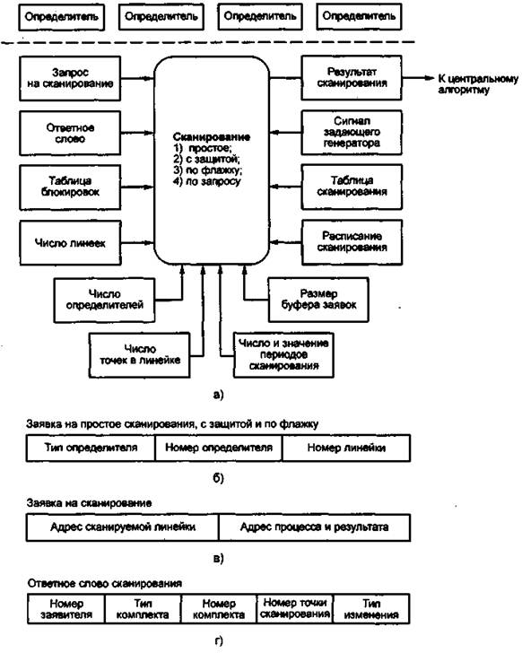 Некоторые особенности алгоритма сканирования порождаются структурой оборудования. Датчики, подлежащие сканированию для определения поступления вызова, называемые «точки сканирования», включаются в «линейки сканирования». Они образуют матрицы, называемые определителями. На станции может быть несколько определителей — от 1 до 100. Поэтому адрес каждой точки сканирования определяется номером определителя, номером линейки в определителе и номером точки в этой линейке. На рис. 2.68, а показаны эти входные данные, которые задают программному обеспечению необходимые параметры. Некоторые из точек могут быть заблокированы, для чего задается таблица блокировок, которая содержит «маски», исключающие из процесса сканирования некоторые точки. Число определителей, число линеек, таблица блокировок, число точек в линейке относятся к полупостоянным данным, отображающим параметры оборудования. Кроме этого имеются полупостоянные данные, относящиеся к процессу.