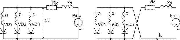 Так как вентили выпрямителя как правило неуправляемые, ток Iи может протекать по любой из фаз вентильной обмотки, однако не во всех случаях будет иметь место инвертирование тока.