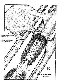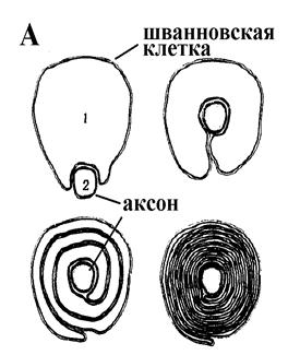 Рис. 13 А – образование миелиновой оболочки; Б – строение миелинизированного нервного волокна