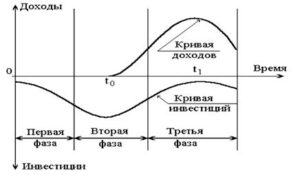 Рис.. Изменение инвестиционных затрат и приносимого ими дохода на разных стадиях инвестиционного проекта