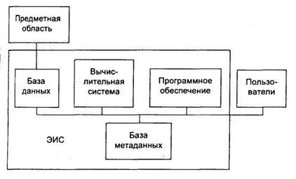 В качестве предметной области можно изучать не только материальные системы, но и саму ЭИС. Выделяемые в ЭИС объекты, свойства и взаимодействия служат понятийной основой для моделей создания и функционирования ИС. Такие компоненты ИС, как база данных и программное обеспечение, не являются физическими объектами, поэтому информационное отображение ИС осуществляется в метаинформацию. Метаинформацию следует представлять как информацию об информации.