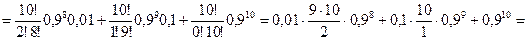 Пример. Для нормальной работы автобазы на линии должно быть не менее восьми автомашин, на автобазе всего десять машин. Вероятность невыхода каждой автомашины на линию равна