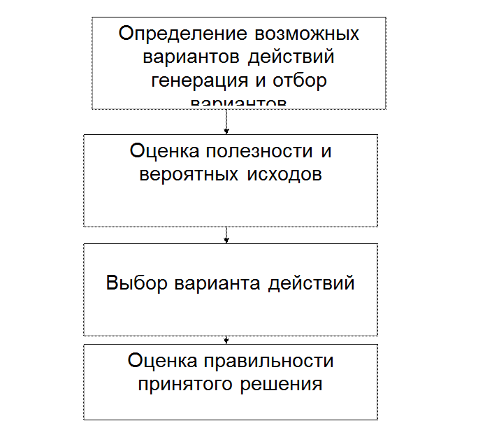 Таким образом, мы вплотную подошли к определению понятия «принятие решения». Принятие решения — это совокупность психических процессов, основными функциями которых являются определение возможных вариантов действия, оценка их полезности и вероятностей, выбор одного из возможных вариантов действия и оценка правильности сделанного выбора.