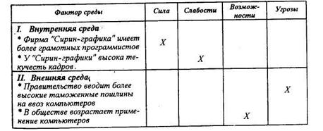 Одним из наиболее распространенных и признанных методов оценки среды является метод СВОТ (SWOT - по начальным буквам английских слов "сила", "слабости", "возможности", "угрозы"). Метод СВОТ, будучи способом оценки среды, в то же время имеет более широкое применение, так как используется уже в стратегическом анализе и определении конкретных перспектив фирмы^В рамках метода СВОТ организация, с одной стороны, выявляет и оценивает собственные сильные и слабые стороны, с другой стороны, определяет возможности и угрозы, содержащиеся во внешней среде. ^Простым примером применения метода СВОТ для оценки может послужить таблица, составленная для гипотетической фирмы "Сирин-графика", занимающейся производством компьютерных технологий и продажей компьютеров (табл. 4). *