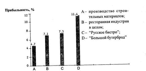 На практике наиболее приемлемым способом определения уровня прибыли является выбор показателей на основе сравнения результатов деятельности фирмы с результатами фирм в других отраслях и подобных фирм в данной отрасли. Так, фирма "Большой бутерброд" может сравнить свои показатели прибыли с аналогичными показателями фирмы, производящей строительные материалы, с уровнем прибыли сети ресторанов "Русское бистро", а также со среднеотраслевыми показателями по ресторанной индустрии (рис. 12).