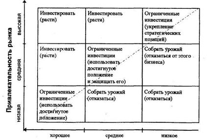 Как видно из матрицы (рис. 18), верхний левый угол означает благоприятные перспективы для роста, диагональ, разделяющая верхний левый угол и нижний правый угол, - двойственное положение и ограниченный рост, нижний правый угол - отсутствие реальных возможностей будущего развития.