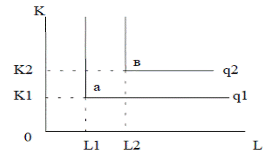 где q - объем производства, K - капитал как фактор производства, L - труд как фактор производства, a и b - коэффициенты пропорциональности данных факторов.
