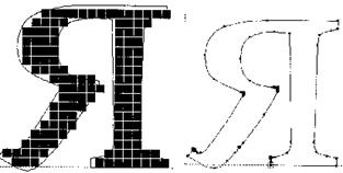 В реально существующих шрифтах, используемых в издательских системах, наиболее распространены два метода описания шрифтов: растровый и контурный. Некоторое представление о них дают два следующих рисунка (соответственно левый и правый).