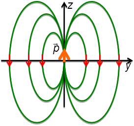 Вспомнив общее определение силовых линий, уравнения силовых линий, перейдем к рассмотрению нашей задачи. Точечный диполь – это система из двух зарядов одинаковой величины, но разного знака, размеры которых и расстояние между ними существенно меньше расстояния до точки наблюдения. За направление вектора дипольного момента принято направление от отрицательного заряда к положительному. Дипольный момент, как полярный вектор имеет аксиальную симметрию – при любом повороте вокруг оси диполя положения зарядов не изменяются. Поскольку конфигурация электрического поля полностью определяется расположением зарядов, электрическое поле, создаваемое диполем, также имеет аксиальную симметрию. Для нас это означает, что мы можем найти уравнение силовых линий в любой плоскости, содержащей дипольный момент. Зная картину силовых линий в этой плоскости, мы легко можем найти конфигурацию силовых линий во всем пространстве, поворачивая нашу плоскость относительно оси диполя. Для удобства расположим дипольный момент в начале координат, направив его вдоль оси