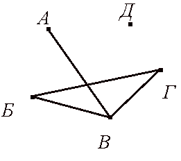 | На рисунке изображен граф с пятью вершинами. Степень вершины А обозначим Ст.А. На рисунке: Ст.А = 1, Ст.Б = 2, Ст.В = 3, Ст.Г= 2, Ст.Д= 0. |