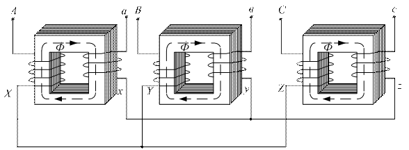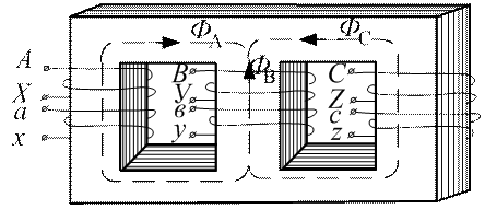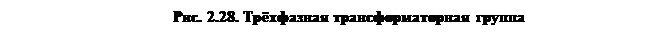 Данный тип представлен на рис. 2.28. Трёхфазная трансформаторная группа получается из трёх однофазных трансформаторов, обмотки которых соединены