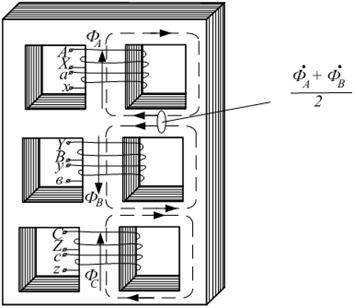 Если на первичную обмотку подаётся симметричная система трёхфазных напряжений, то по обмоткам протекают симметричные системы токов, следовательно, потоки трёх фаз также образуют симметричную систему, тогда