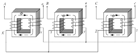 Чтобы избежать неблагополучных явлений при намагничивании сердечника трансформатора, одну из обмоток рекомендуется соединять в треугольник.