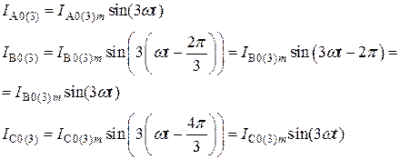 Третьи гармоники тока замыкаются по нулевому проводу, при этом ток холостого хода в каждой фазе содержит третьи гармоники тока. А поскольку ток является несинусоидаильной функцией времени, то поток изменяется во времени синусоидаильно, и процесс намагничивания происходит без особенностей.