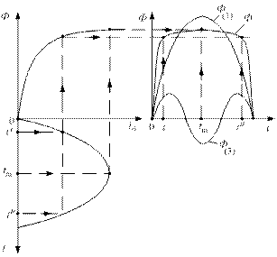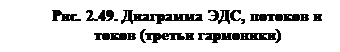 Кривая потока будет иметь уплощённую форму, и кроме основной гармоники, из кривой потока можно выделить высшие гармоники, самая сильная из которых – третья (рис. 1.43). Фазные ЭДС и напряжения также несинусоидальны, и кроме основной гармоники содержат высшие. Частота третьей гармоники ЭДС: