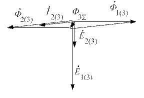 Под действием ЭДС е 2(3) во вторичной обмотке будет протекать ток i 2(3). Создаваемые этим током третьи гармоники потока вторичной обмотки Ф 2(3) будут почти полностью компенсировать потоки Ф (3). Искажения фазных ЭДС и напряжений практически не будет: они синусоидальны. Векторная диаграмма потоков, ЭДС и токов третьей гармоники представлена на рис. 2.49.