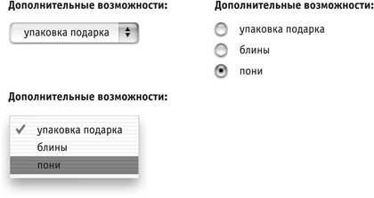 на странице по сравнению с набором кнопок-переключателей, но зато они прячут от пользователя другие варианты выбора. Ввод категории поиска в текстовое поле, пожалуй, снизит нагрузку на систему управления базами данных, но одновременно увеличит нагрузку на пользователя. Если варианты поиска ограничиваются шестью категориями, лучше воспользоваться флажками.