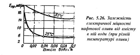 Електрична міцність електроізоляційних олив, яка визначається в стандартному пристрої (рис. 5.24), різко знижується за наявності в них краплинок води в колоїдному стані, завислих у рідкому діелектрику частинок смолистих речовин та інших забруднень. Найбільш шкідливе забруднення діелектрика водою (рис. 5.25).