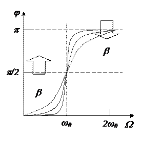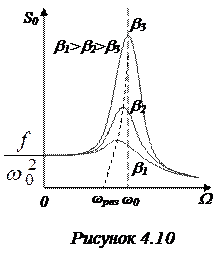 а резкое увеличение амплитуды вынужденных колебаний при приближении частоты вынуждающей силы к резонансной частоте называетсярезонансом. Зависимость амплитуды колебаний от частоты W показана на рис. 4.10. Из этого рисунка видно, что чем меньше затухание b, тем выше и острее максимум амплитуды и тем ближе резонансная частота к собственной.