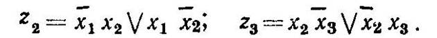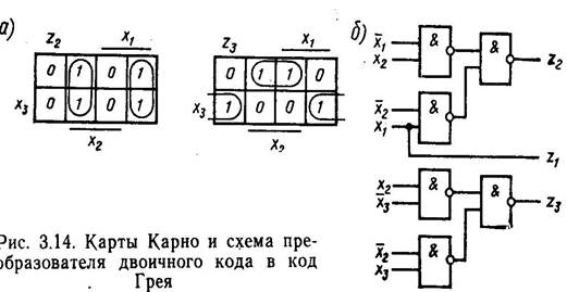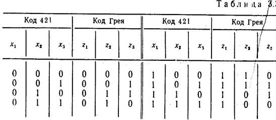 Двійкове число в коді Гріючи записується по наступному принципі. Якщо в старшому сусідньому стосовно даного розряді двійкового числа стоїть 0, у даному розряді коду Гріючи зберігається цифра, записана у двійковому коді, якщо ж 1, цифра міняється на зворотну. Кожна з вихідних змінних %, z2, z3 є функцією вхідних змінних х1год х2, х3