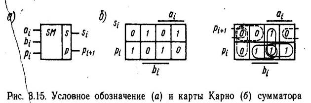 Суматори. Однорозрядний суматор (мал. 3.15) має три входи для подачі цифр розрядів що складаються a і bt