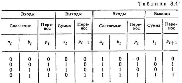переносу piy На його виходах формуються сума st і перенос призначений для передачі в наступний розряд. У табл. 3.4 показане функціонування однорозрядного суматора.