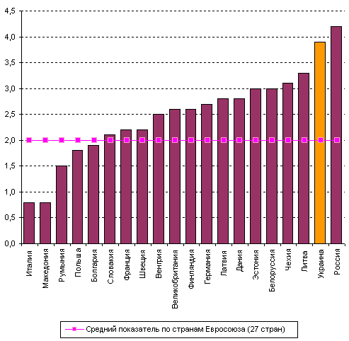 Рисунок 3. Общие коэффициенты разводимости населения Украины и других европейских стран в 2005 году