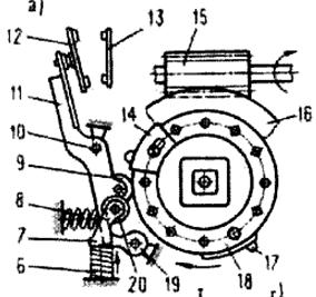 Контакти 13 замикаються рухомими контактами 12, закріпленими на важелі 11, що повертається на осі 10. До дії включаючого кулачка 14 під дією пружини 8 на важіль 11, контакти 13 знаходяться у розімкненому стані. При обертанні шайби на ролик 9 діє кулачок 14, важіль 11 повертається, пружина 8 стискається, і контакти замикаються. При включеному стані контакти 13 утримуються клямкою 7, що обертається відносно осі 19 під впливом зусилля стиснутої пружини 6. При натисненні кулачком 17 на ролик клямки 20 важіль 11 звільняється від клямки, що приводить до розмикання контактів 13.