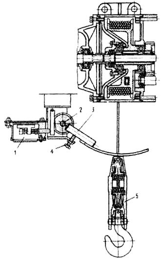 У крайньому верхньому положенні гакова підвіска 5 повертає важіль 3, що приводить до вимкненя контактів кінцевого вимикача. Положення важеля 3 регулюється болтом 4.