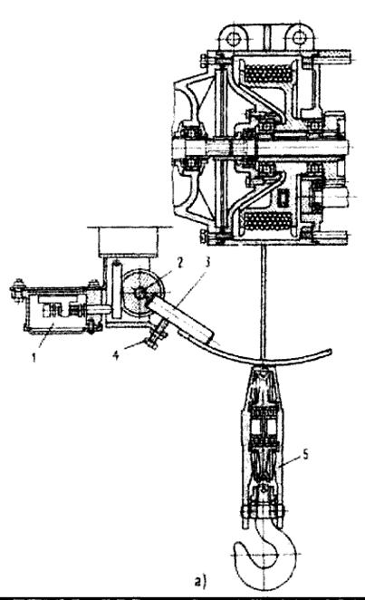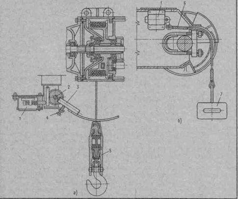 Обмежувач висоти підйому вантажу, що встановлюється на електроталях і кранах (мал. 137, а), має контакти кінцевого вимикача 1, які утримуються в замкнутому положенні при нормальній роботі механізму вагою важеля 3, встановленого на осі 2. У крайньому верхньому положенні підвіска крюка 5 повертає важіль 3, що приводить до виключення контактів кінцевого вимикача. Положення важеля 3 регулюється болтом 4.
